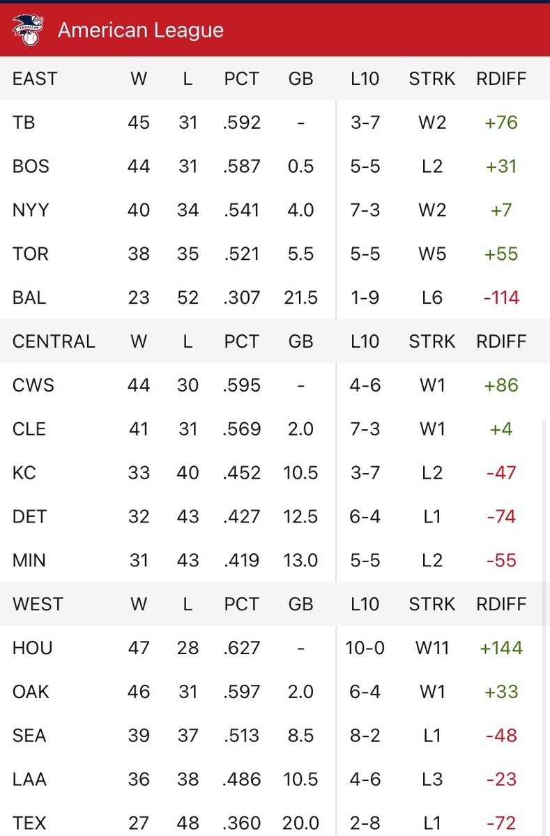 ②中地区:CLEインディアンスが、首位CHIホワイトソックスに2.0ゲーム差まで迫ってきました。