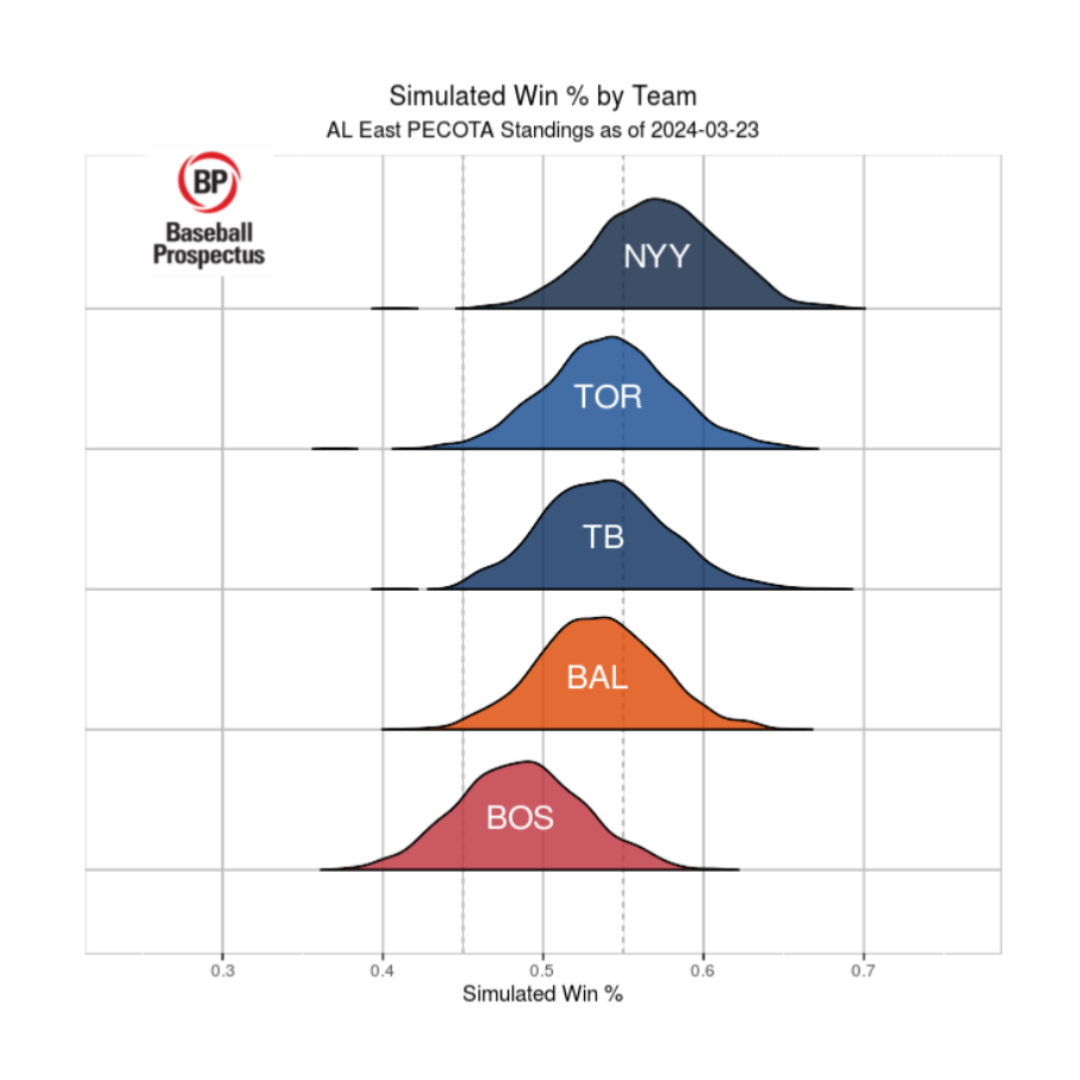 PECOTA Standings - Baseball Prospectus による順位予想(2024年3月23日付)は、以下の通りです。